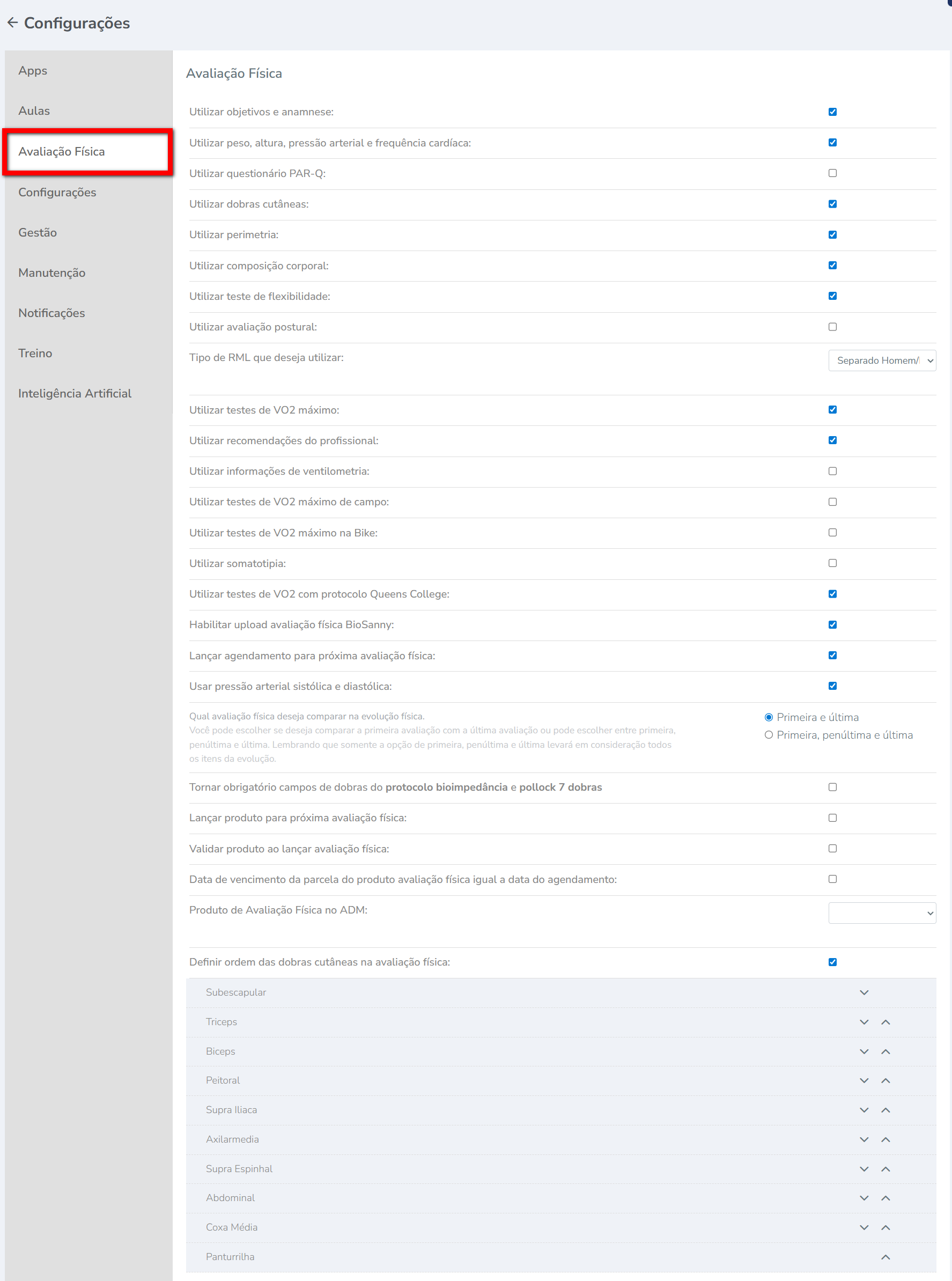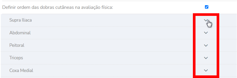 - Definir ordem das dobras cutâneas na avaliação física: marcando esta configuração, será listado as dobras cutâneas da avaliação física e você pode modificar a ordem destas clicando na seta a sua frente.