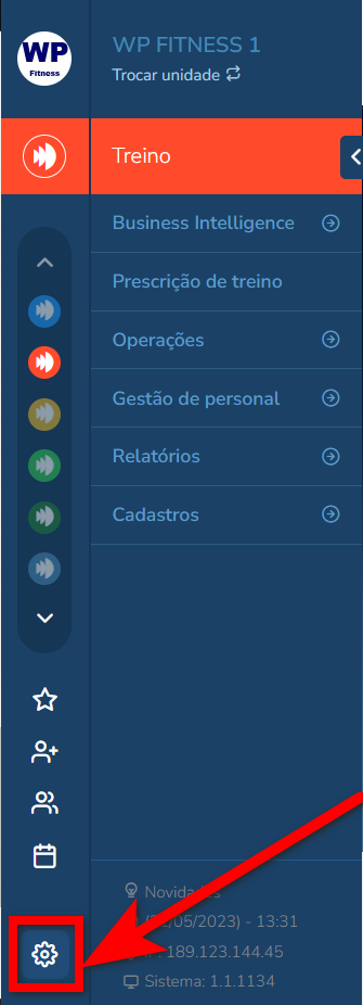 1. No menu lateral esquerdo do sistema clique no ícone de “Engrenagem“;
