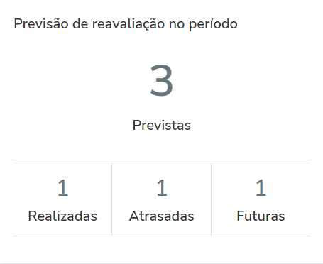 4. O segundo indicador é o "Previsão de reavaliação no período"; Este indicador tem como objetivo apresentar a quantidade de reavaliações físicas previstas para o período selecionado, apresentando o total e também separado por reavaliações já realizadas, que estão atrasadas e reavaliações previstas para realizar no futuro.