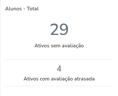 5. O indicador "Alunos - Total"; Este indicador tem como objetivo apresentar a quantidade de alunos ativos que ainda não possuem nenhuma avaliação física lançada e os alunos ativos que estão com avaliação atrasada. O gestor, com essas informações, pode criar estratégias para diminuir o número de alunos ativos sem avaliação ou com avaliações atrasadas e com isso gerar maior engajamento e fidelização com os clientes.