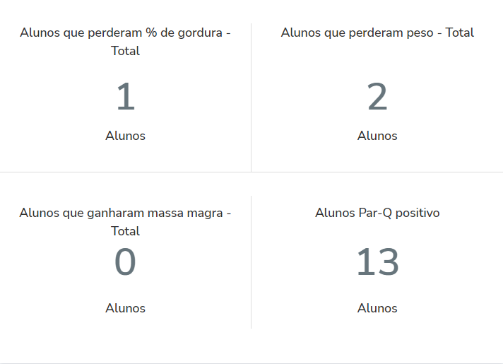 6. Os indicadores "Alunos que perderam % de gordura", "Alunos que perderam peso", "Alunos que ganharam massa magra" e "Alunos Par-Q positivo"; Estes indicadores têm como objetivo comparar a evolução dos alunos ativos que possuem mais de uma avaliação física lançada. O gestor, com essas informações, pode criar estratégias para aumentar o número de alunos que perderam peso, diminuíram o % de gordura e que ganharam massa magra e com isso gerar maior engajamento e fidelização com os clientes.