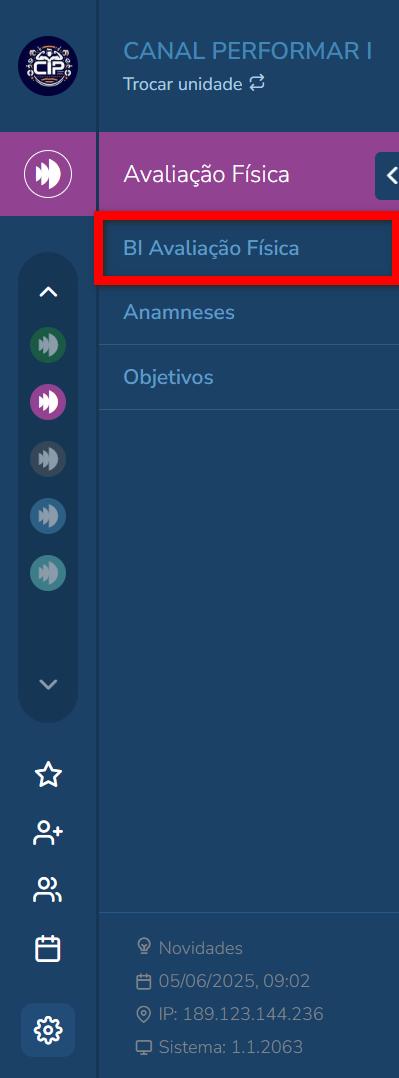 1. No menu do módulo Avaliação Física, clique em “BI Avaliação Física”;