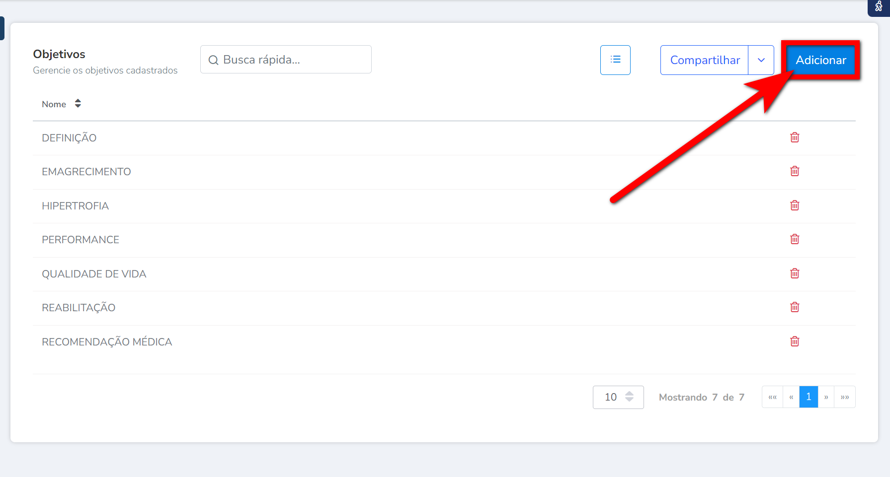 2. Será apresentada uma nova tela com o cadastro de todos os Objetivos ativos. Para cadastrar um novo objetivo clique em "Adicionar";