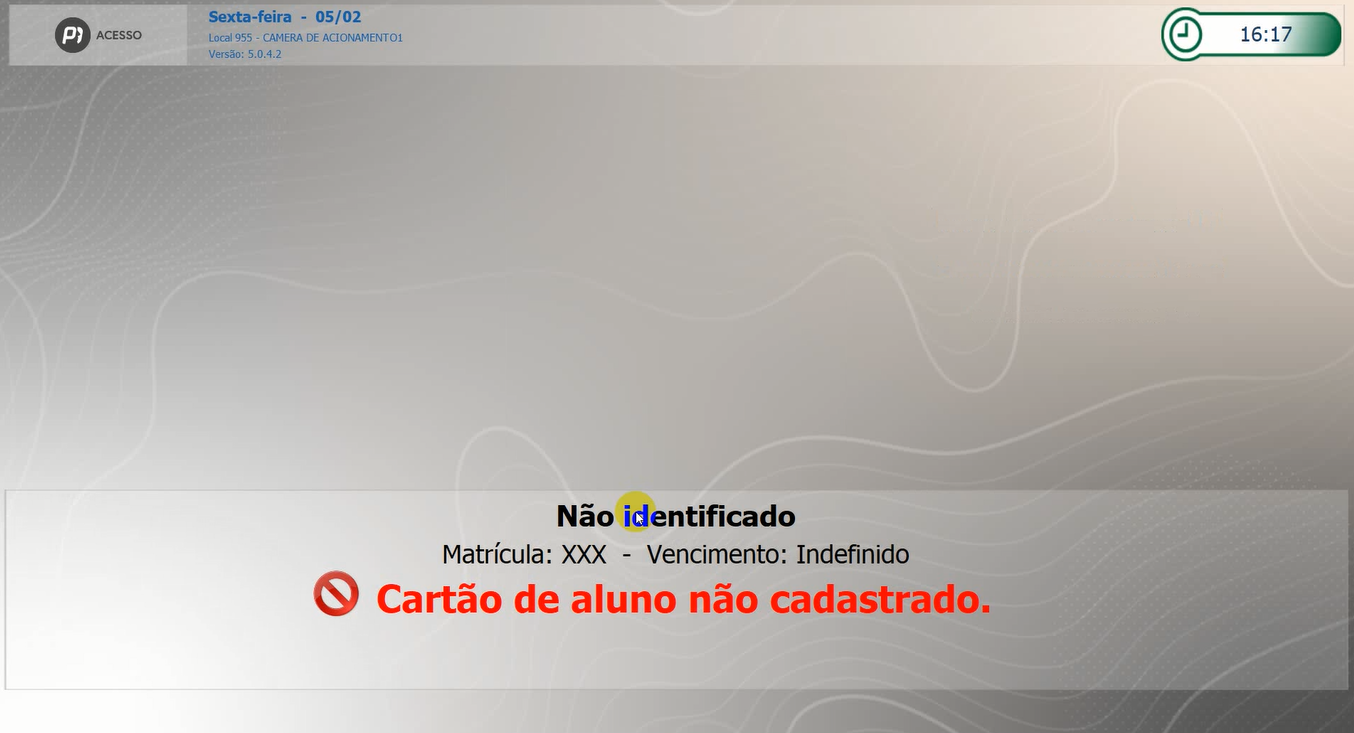Pode acontecer de o sistema de acesso apresentar a mensagem "Cartão de Aluno Não Cadastrado". Isso geralmente acontece quando o cadastro do aluno é excluído do sistema ADM porém seu cadastro de digital/facial continua cadastrado no Acesso.