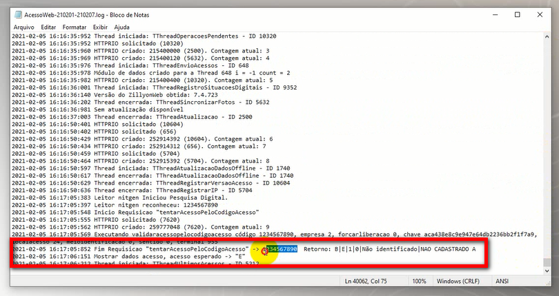 1. No programa do Acesso, clique no campo de log para poder identificar o "código de acesso" desse aluno; Dê 2 cliques no quadrado com 0 (zero);