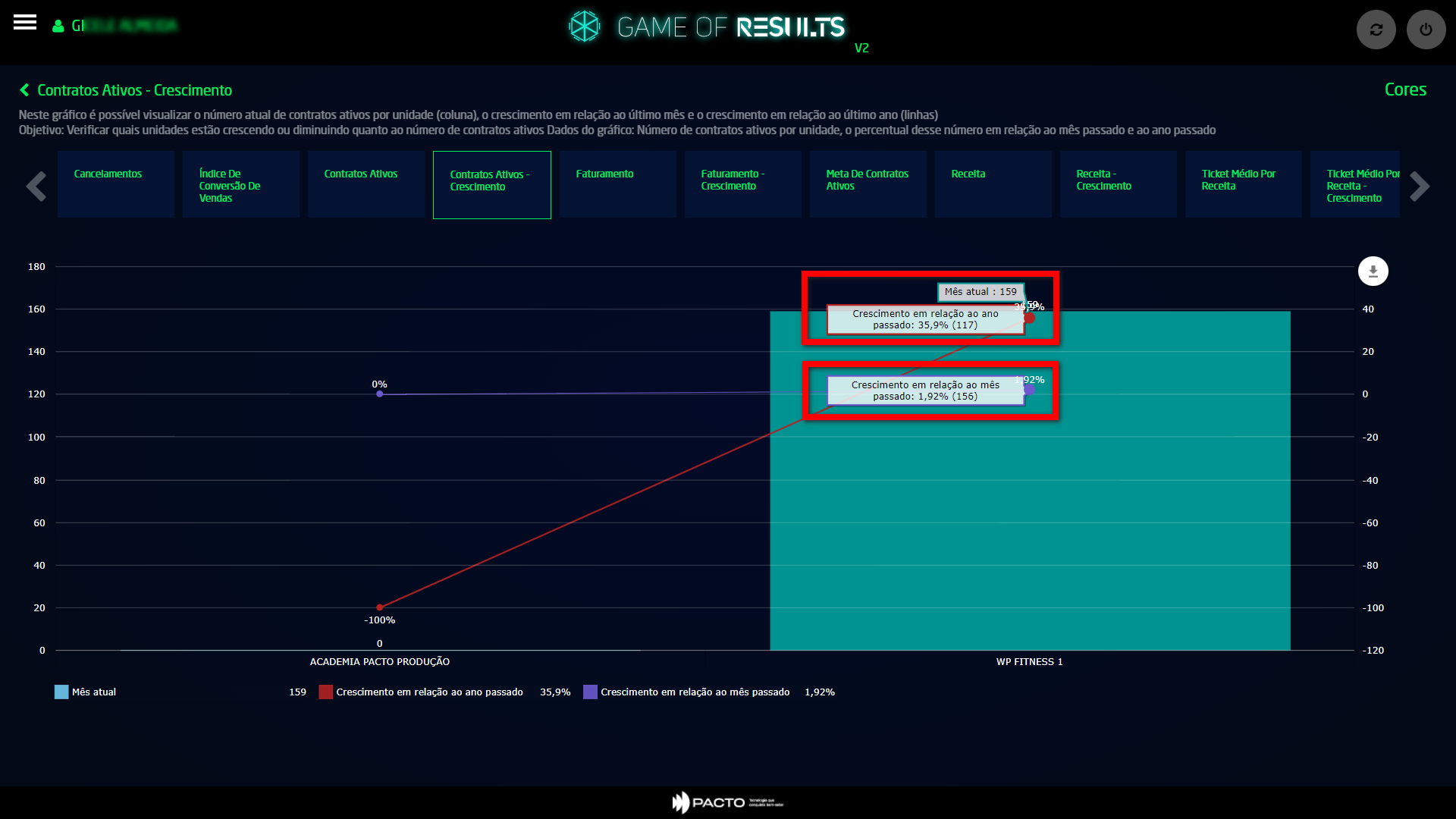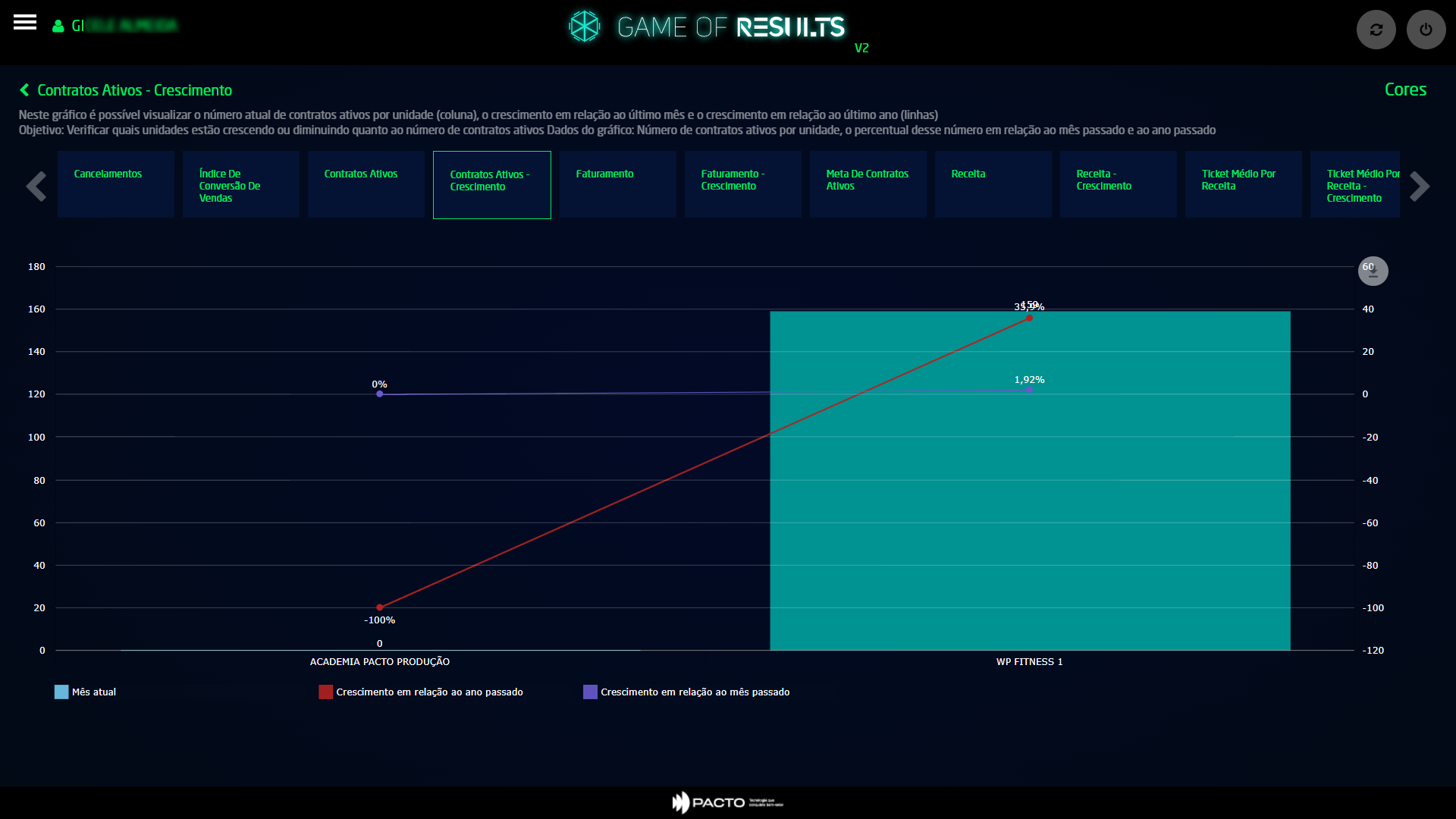 Dessa forma você consegue visualizar as unidades que estão no seu grupo de empresa, e avaliar qual unidade tem se mantido com o maior número de contratos ativos e qual foi a porcentagem de crescimento ou redução de cada uma referente à meta.