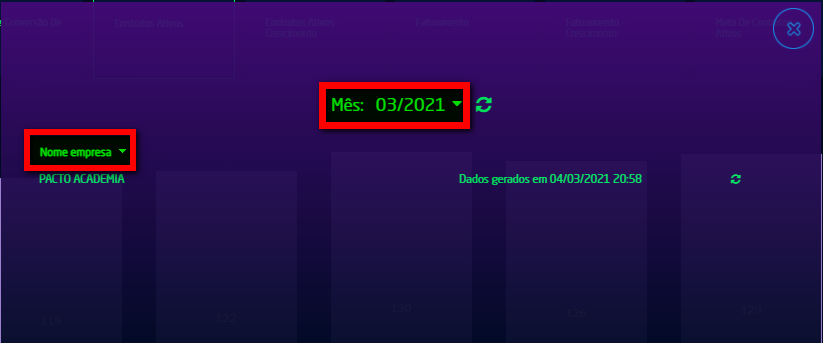 que será exibido um pop-up apresentado qual Mês e Ano e a academia que os sistema esta gerando os resultados. Assim, nesses campos você selecionar um período busca diferente ou mesmo empresa, que após clicar para aplicar o gráfico será ajustados aos filtros selecionados;