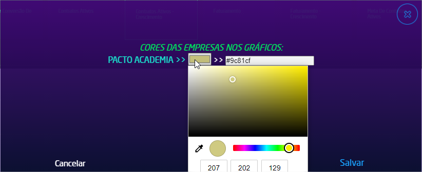 6. A ferramenta também permite que seja alterado a cor que representa a empresa no gráfico. Para isso, basta clicar no ícone "Cores" na parte superior da tela, que será apresentado um pop-up onde poderá fazer a escolha da cor;