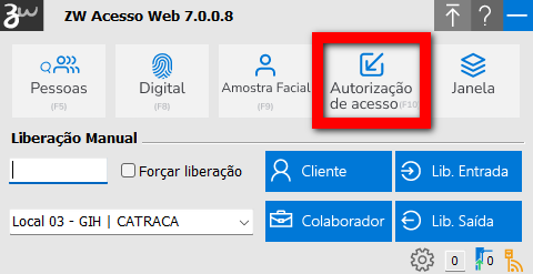 2. Será apresentado uma tela menor na parte lateral da tela, clique na opção "Autorização de Acesso";