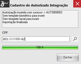 4. Aguarde até que a importação seja realizada 100%. O sistema apresentará a mensagem "Autorização inserida com sucesso -> AUT0000003" e "Importação finalizada" para indicar que a importação realmente foi realizada.