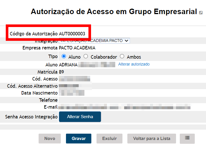 3. Copie o dado apresentado no campo "Código da Autorização", para localizar o cliente no programa de acesso.
