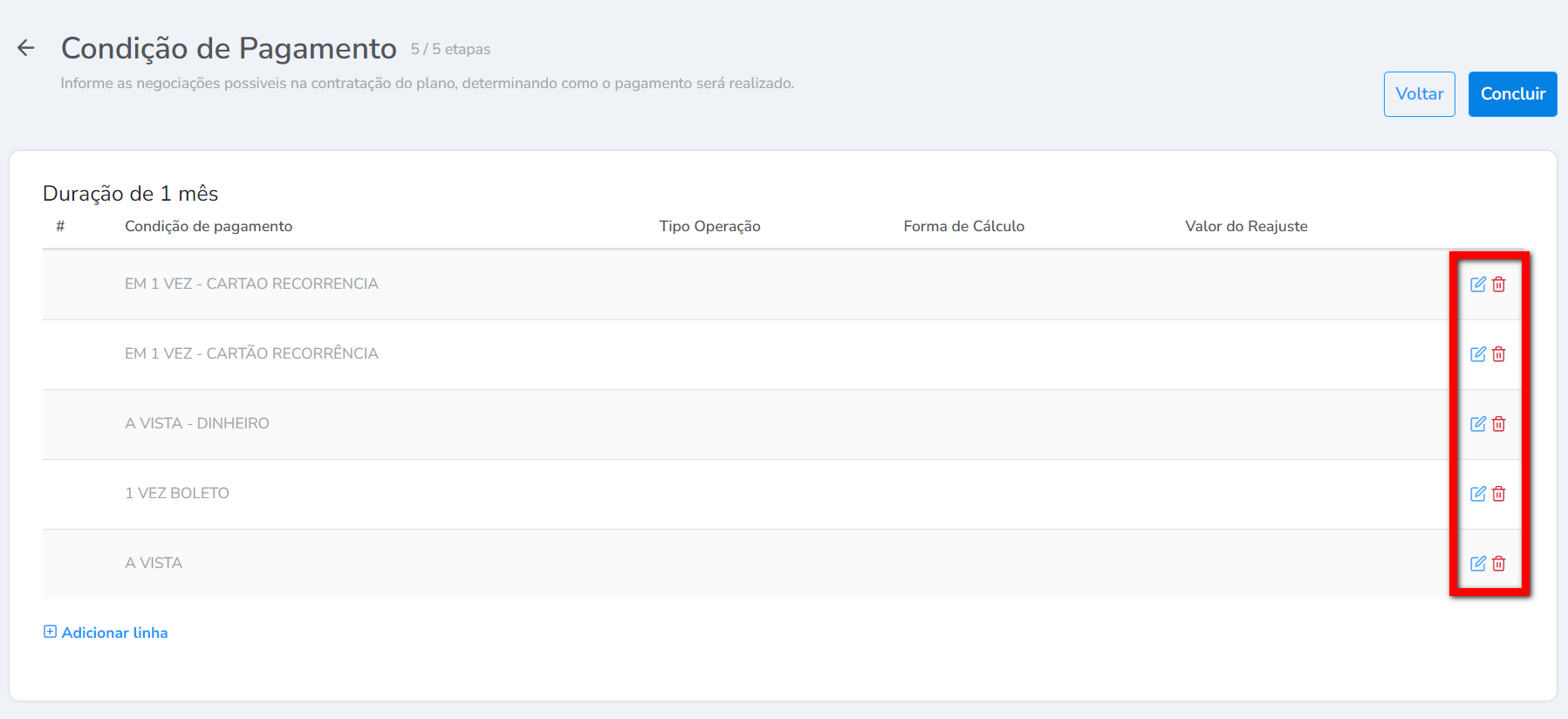 4.3. Na tela "Duração e Valores", clique em "Adicionar Linha", e realize a configuração;