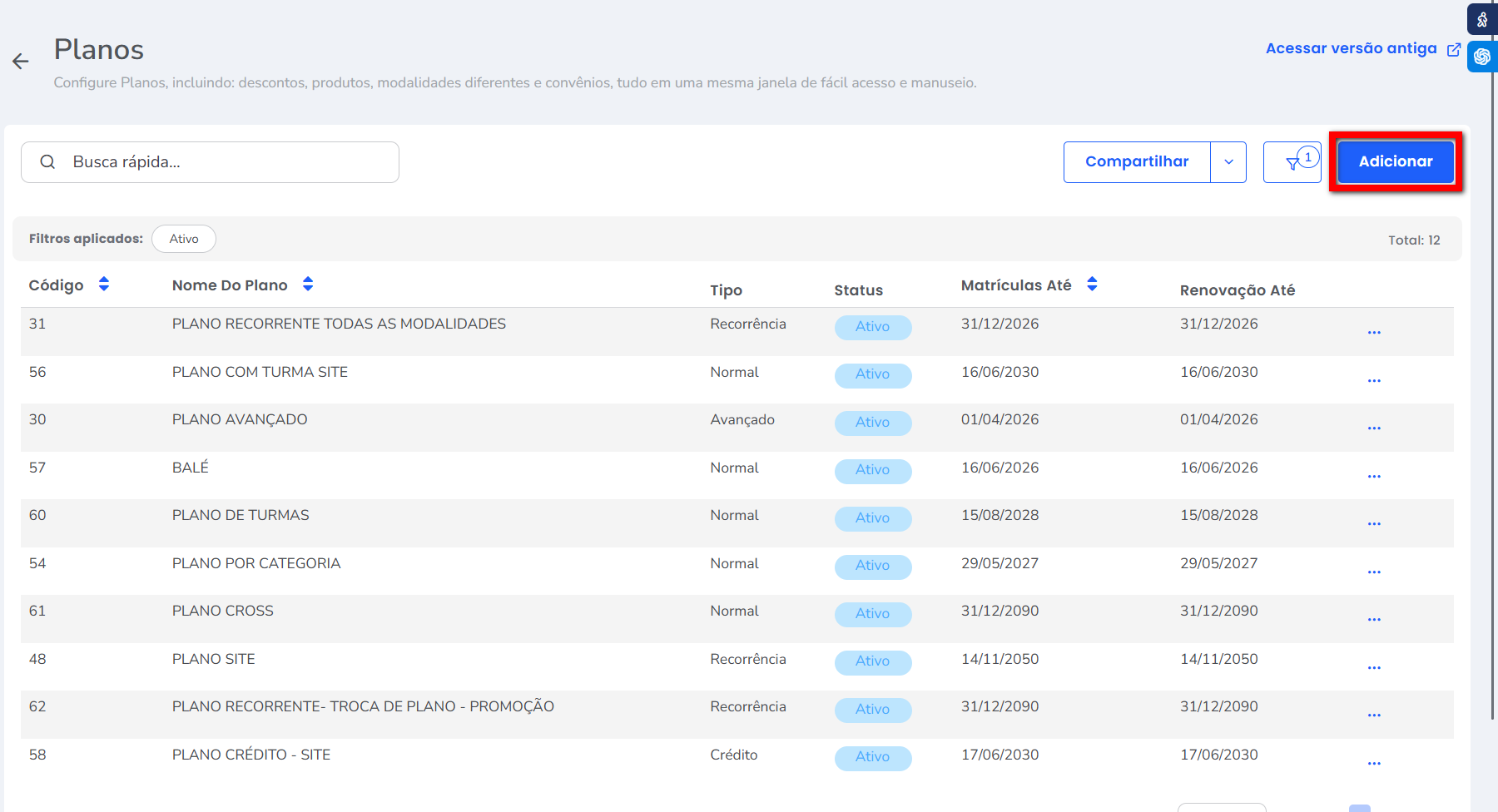 2. Nesta tela contém o cadastro de todos os planos. Clique em “Adicionar“;