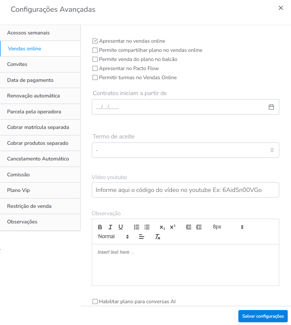 Permitir turmas no Vendas Online: ao marcar está configuração permite realizar a venda com a marcação na turma pelo vendas online;
