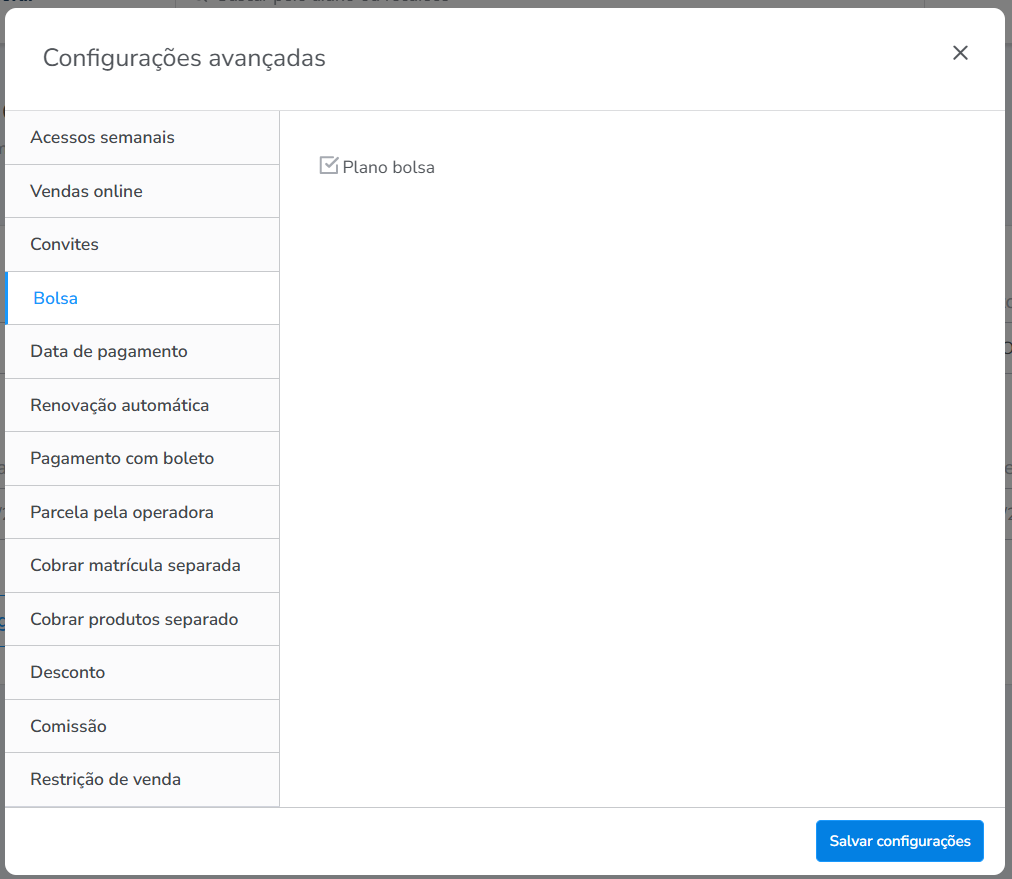 - Plano bolsa: marque esta configuração, caso o plano seja sem custo (bolsa).