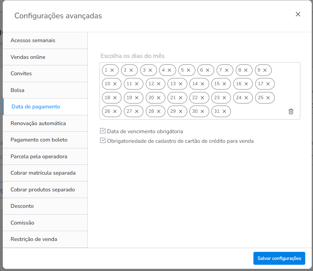 Escolha os dias do mês: nesta configuração, informe as possíveis datas de vencimentos que aparecerão como possibilidade no momento da venda deste plano. Por padrão é preenchido com todas as datas possíveis do mês, mas você pode optar em permitir somente 05, 10, 15, 20, 25, 30;