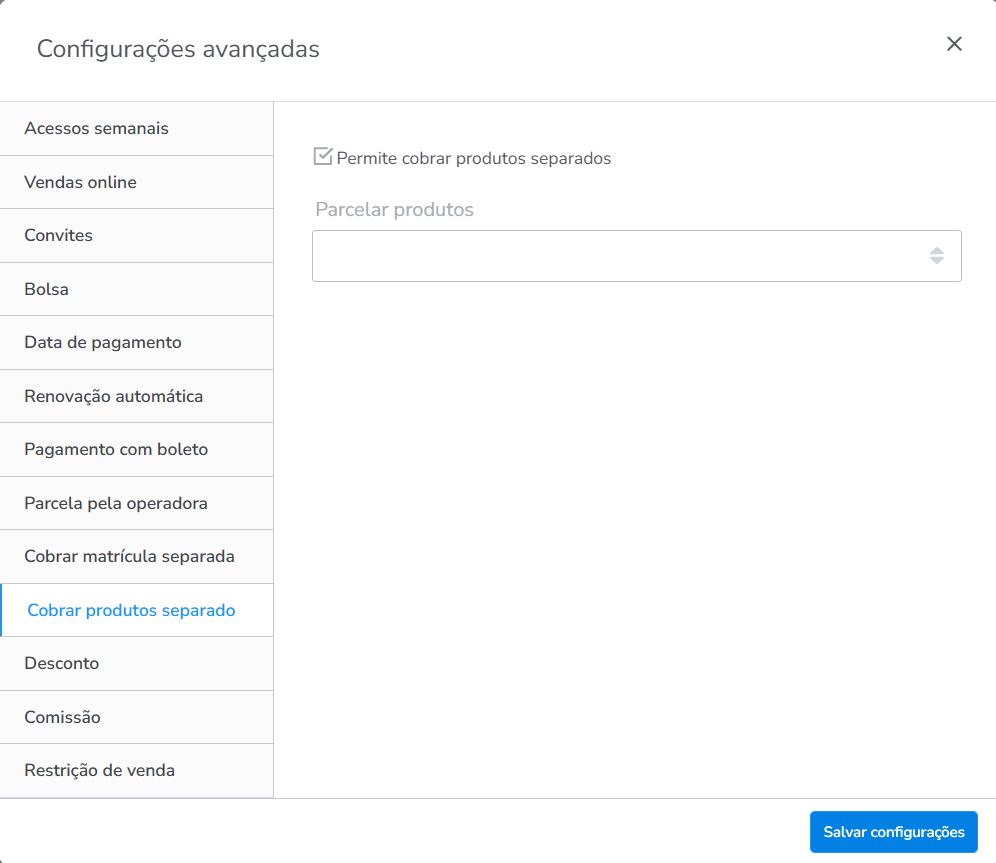 - Permite cobrar produtos separados: habilitando esta configuração, a parcela do valor do produto será separado das demais parcelas do plano, sendo possível colocar em quantas vezes pode ser parcelado.