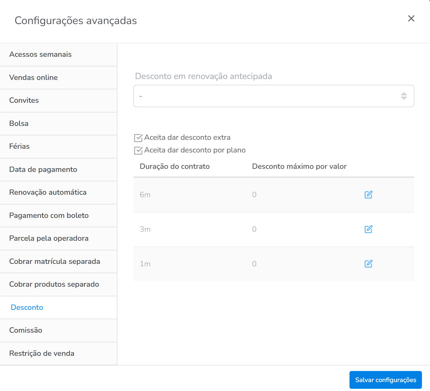 - Desconto em renovação antecipada: nesta configuração você pode selecionar o desconto para o aluno que renovar o plano antecipado;