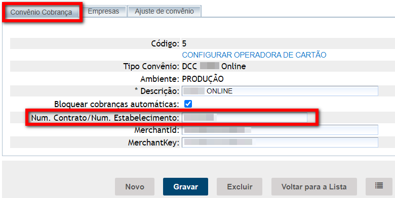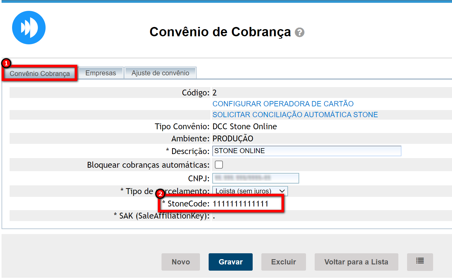 1.2. Selecione o convênio de cobrança da Stone. Logo na guia "Convênio de Cobrança" localize o campo "StoneCode" e verifique se é o mesmo número que consta no portal da Stone.