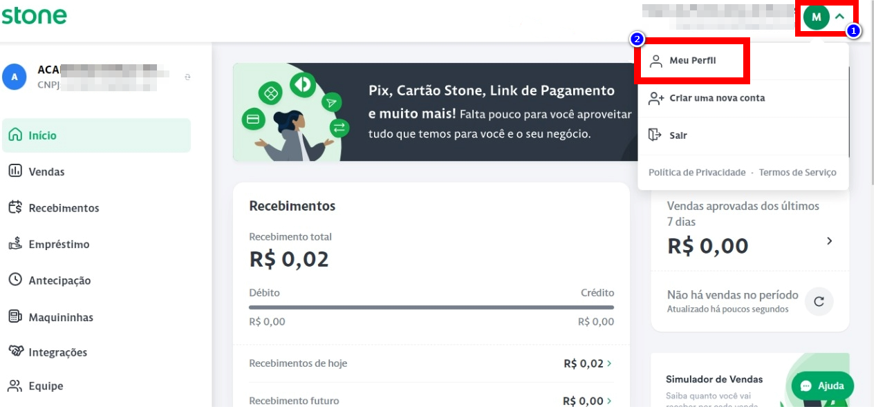 1.2.1. Acesse o portal da Stone e na página inicial clique no ícone na parte superior à direita e após, clique em "Meu Perfil" como mostra a imagem;