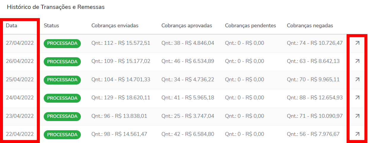 2. Na nova tela, no campo "Histórico de Transações e Remessas" é apresentado um lista com a quantidade de parcelas enviadas, agrupadas por dia do mês. Para verificar cada parcela que compõe a quantidade de cobranças do dia, clique no ícone a frente da descrição do dia que deseja validar;