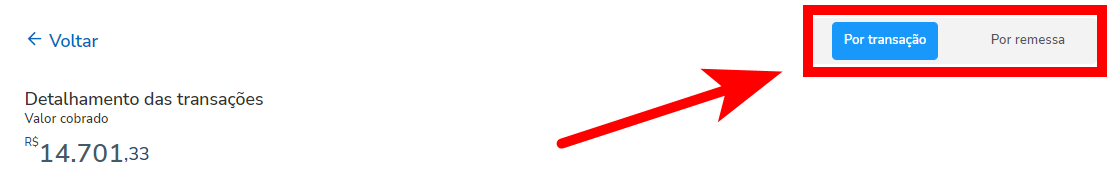 3. Após carregar as informações antes de visualizar o relatório marque, na parte superior da tela, se deseja visualizar as cobranças de "Transação" ou "Remessa".