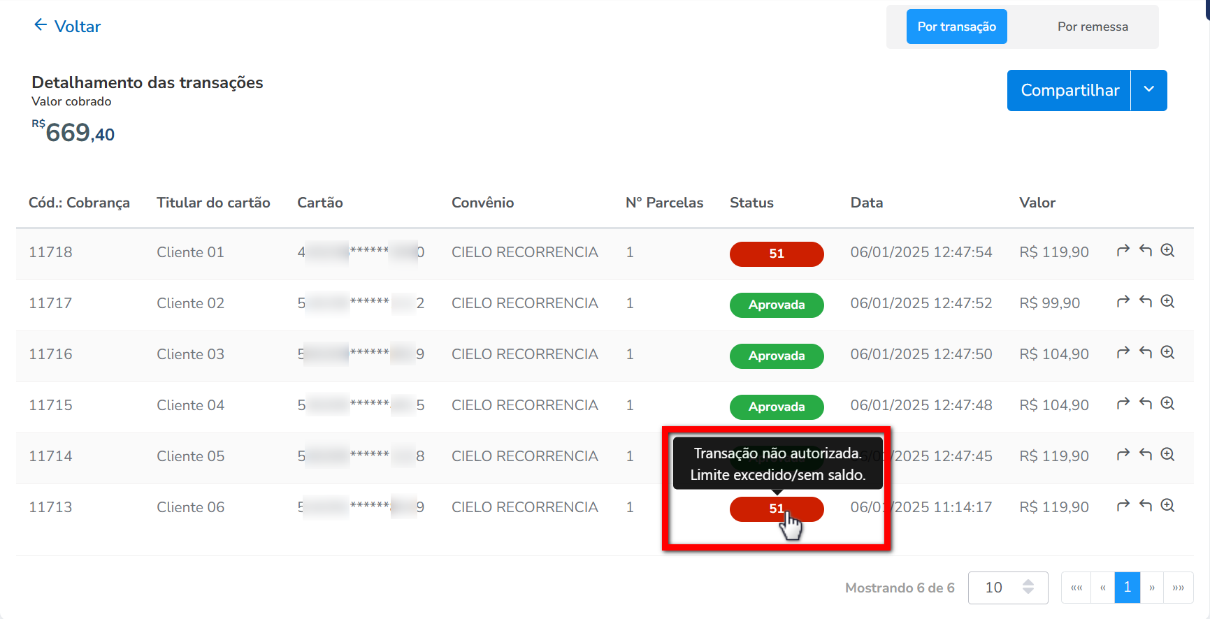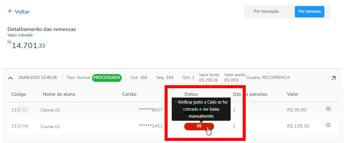 3.2.1. Ao apresentar as parcelas, no campo "Status", posicione o mouse sobre o código de retorno da parcela, e será exibido uma mensagem explicando o porquê deste retorno.