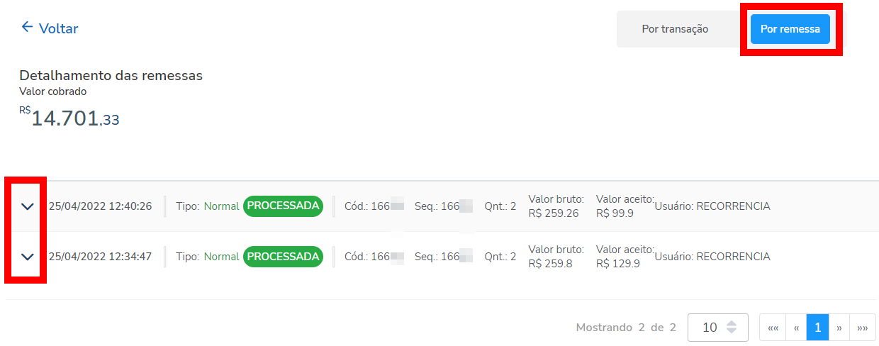 3.2. Caso marque a opção "Por remessa", o relatório irá listar todas as remessas enviadas no dia selecionado. Clique no ícone , na frente de cada remessa, para visualizar as parcelas alocadas nela.