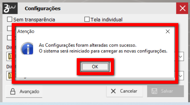 3. Será apresentado uma mensagem informando que as configurações foram alteradas e que é necessário reiniciar o programa do acesso. Clique em “OK”;