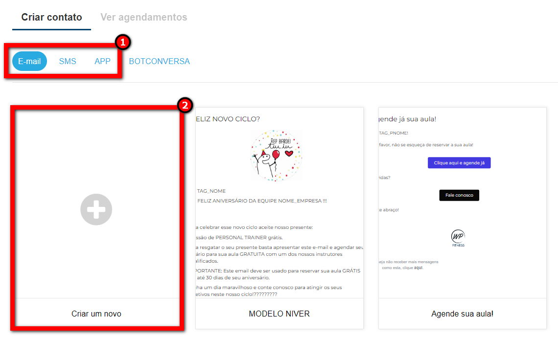 2. Selecione o tipo de contato (sms/e-mail/app) e clique em “Criar um novo”;