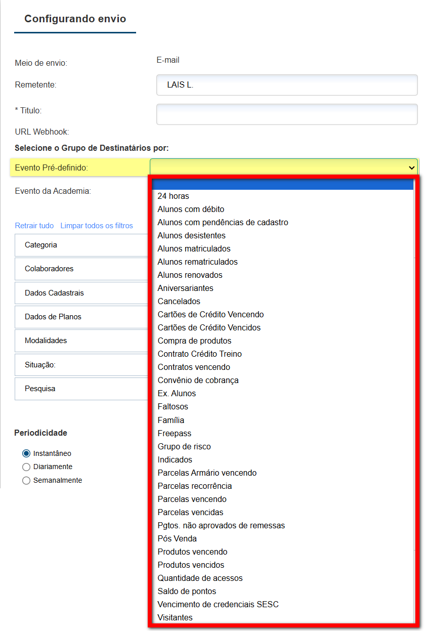 Por exemplo¹: No dia 01/06 o aluno Sérgio comprou 2 águas, 1 camiseta da academia e 1 chaveiro que estão configurados como produto estoque, então ao verificar a meta ou configurar para enviar e-mail dos alunos que compraram produtos e em “Periodicidade” selecionar “Produto Estoque” e que 01/06 esteja dentro do período de busca, então o aluno Sérgio estará na lista desse evento.
