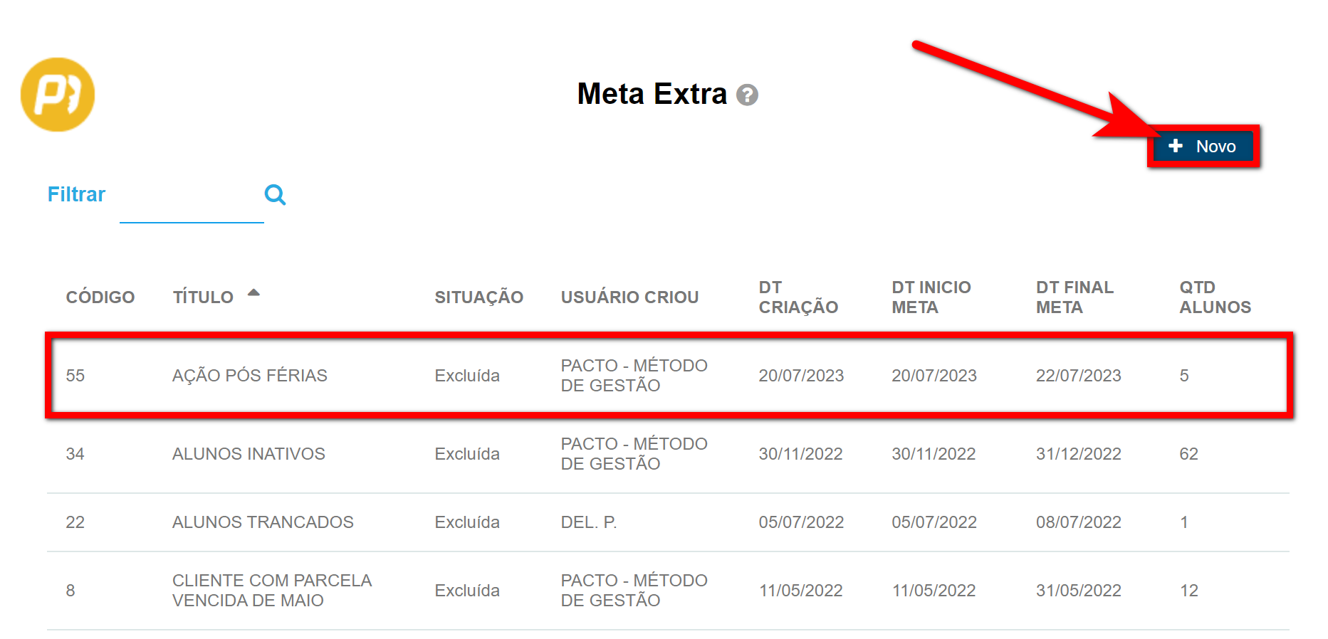 3. Para utilizar o evento Pré-definido, clique em "+ Novo" para cadastrar uma nova meta ou selecione uma meta já existente para editar;