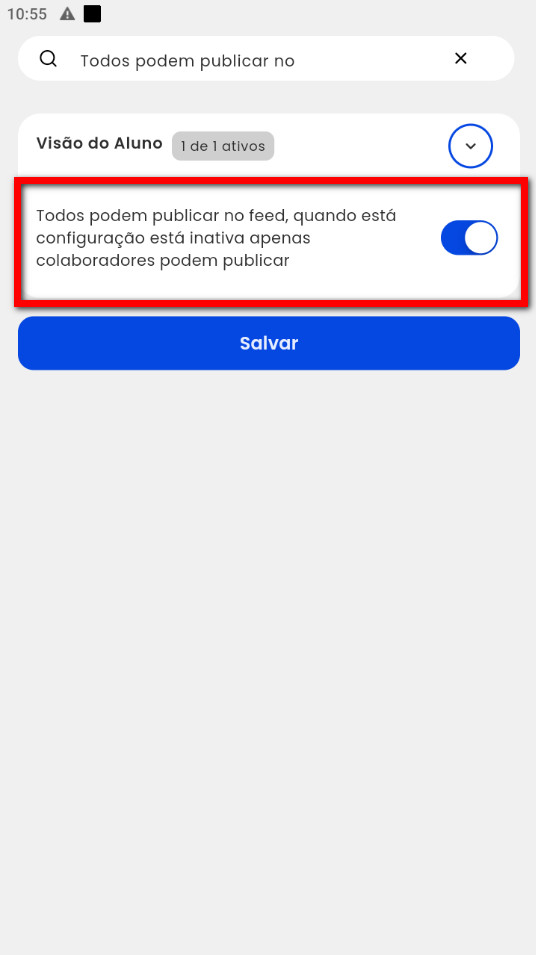 4. Localize e habilite a permissão “Todos podem publicar no feed, quando está configuração está inativa apenas colaboradores podem publicar“;