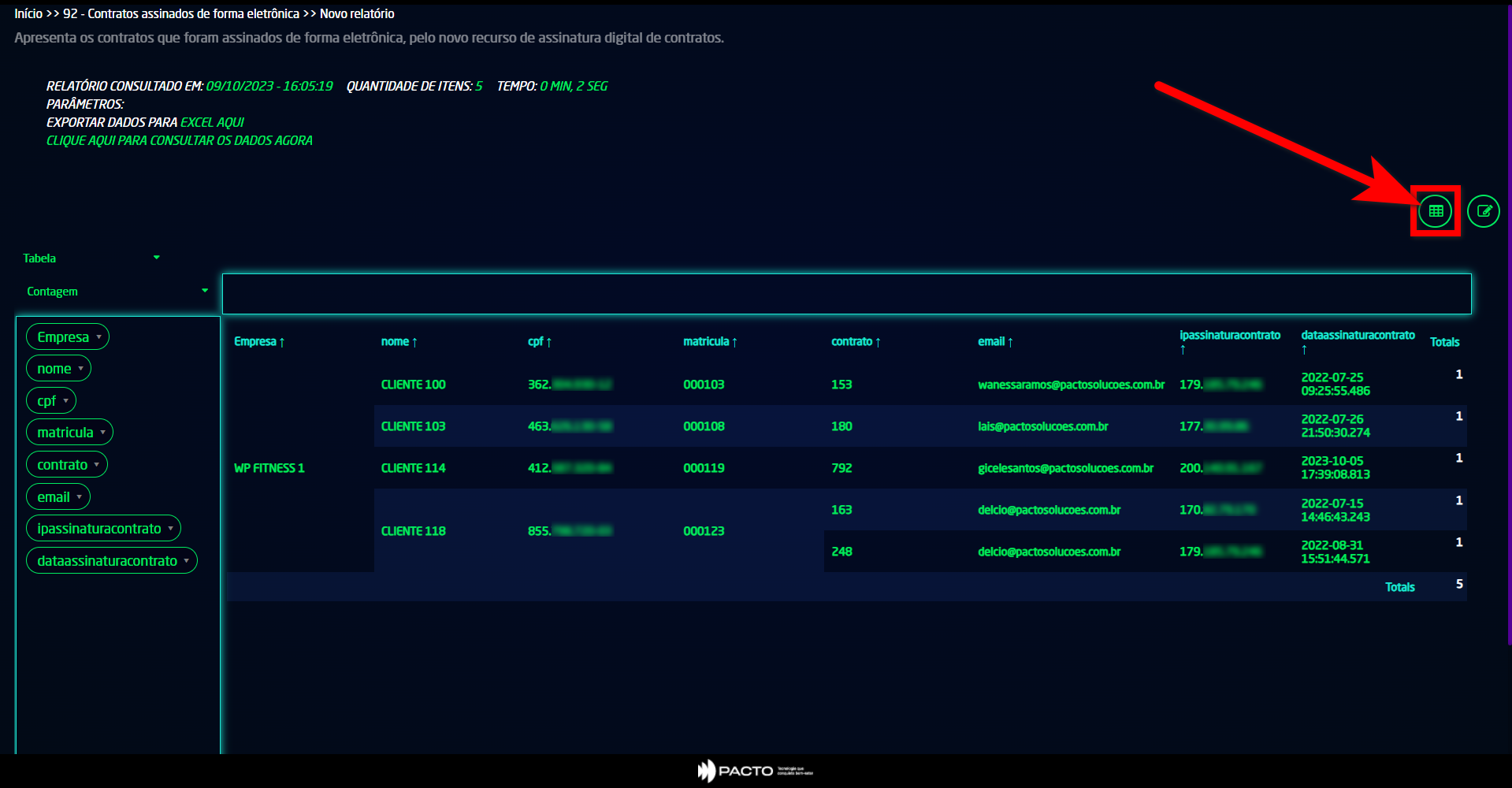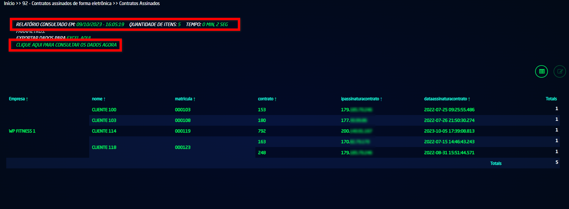 Através deste relatório, é possível visualizar todos os alunos que assinaram os contratos digitalmente por e-mail, incluindo data e horário da assinatura, além do endereço IP em que o contrato foi assinado.