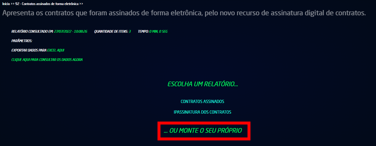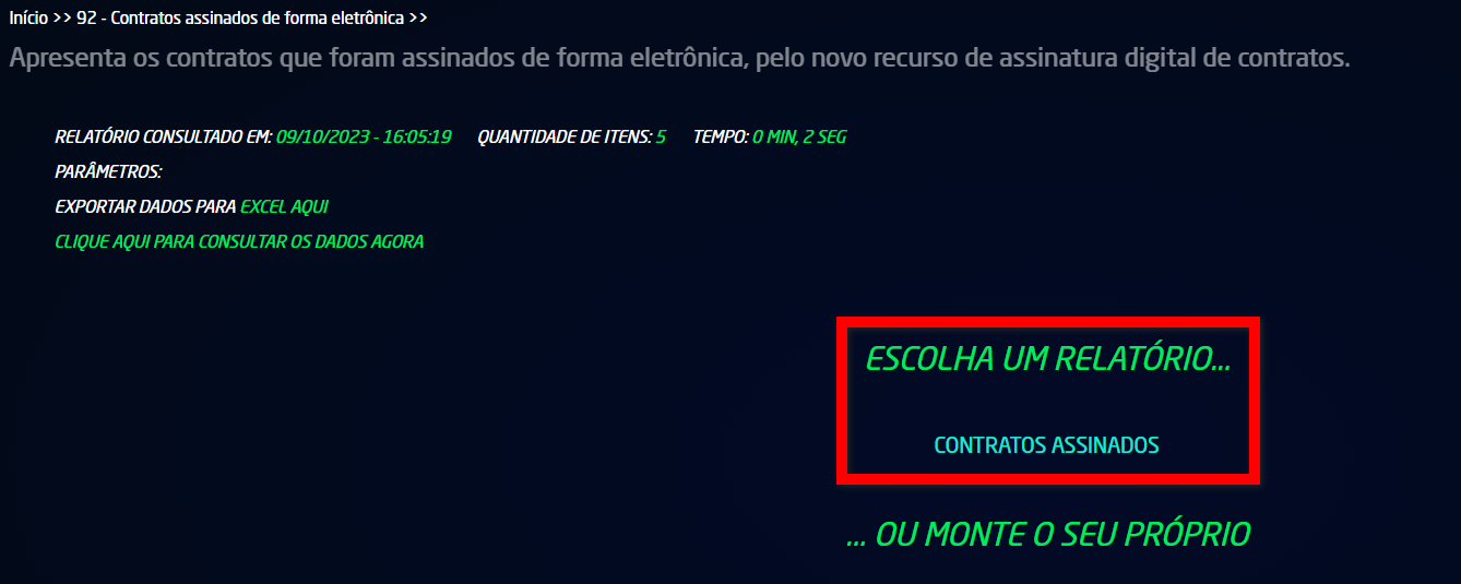 4.1. No campo "Escolha um relatório...", é apresentado o relatório padrão "Contratos assinados". Clique sobre ele;