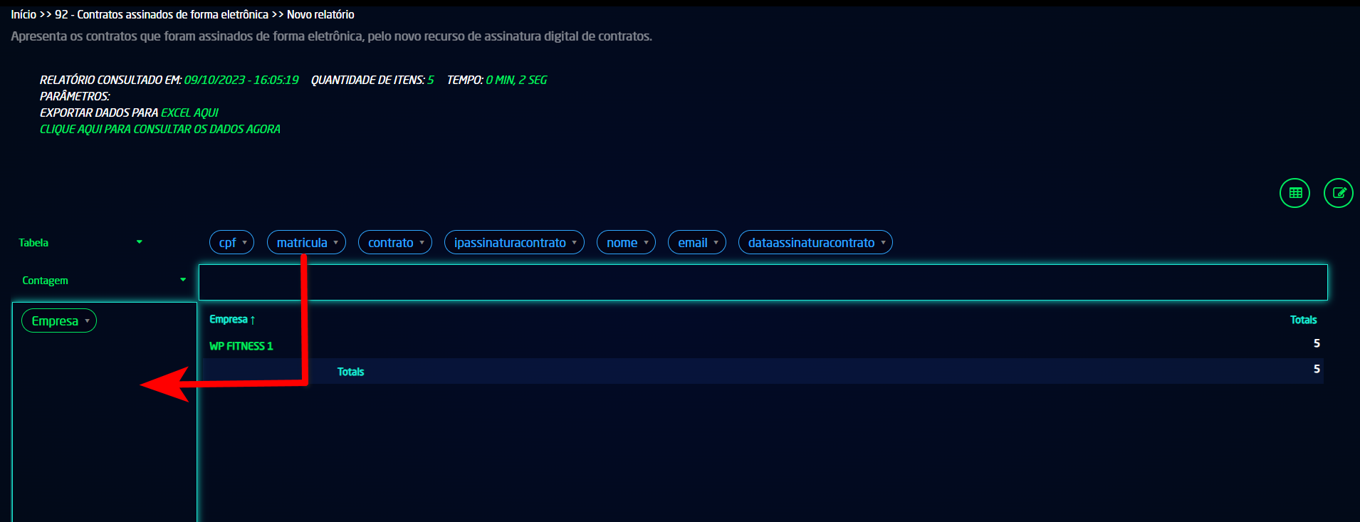 4.2.3. Finalizado o processo de construção, clique no ícone para exportar este relatório em Excel.