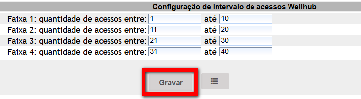3. Em “Configuração de intervalo de acessos Wellhub” informe a quantidade de acessos para as faixas apresentadas; Atenção: a configuração das faixas representa a quantidade de acessos realizados pelos alunos Wellhub. Por exemplo: na faixa 1 configurei que será de 1 até 10 acessos, na faixa 2 será de 11 a 20. Então se meu aluno Wellhub acessou 10 vezes no mês, ele será contabilizado na faixa 1, quando ele acessar a 11ª vez ele já será contabilizado na faixa 2, e assim sucessivamente.