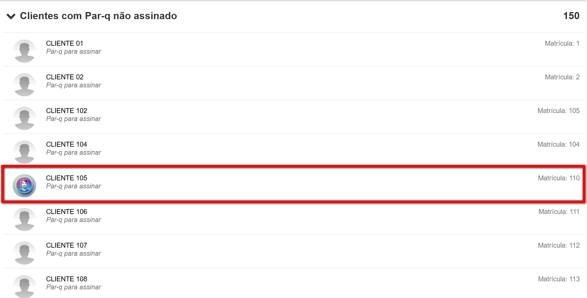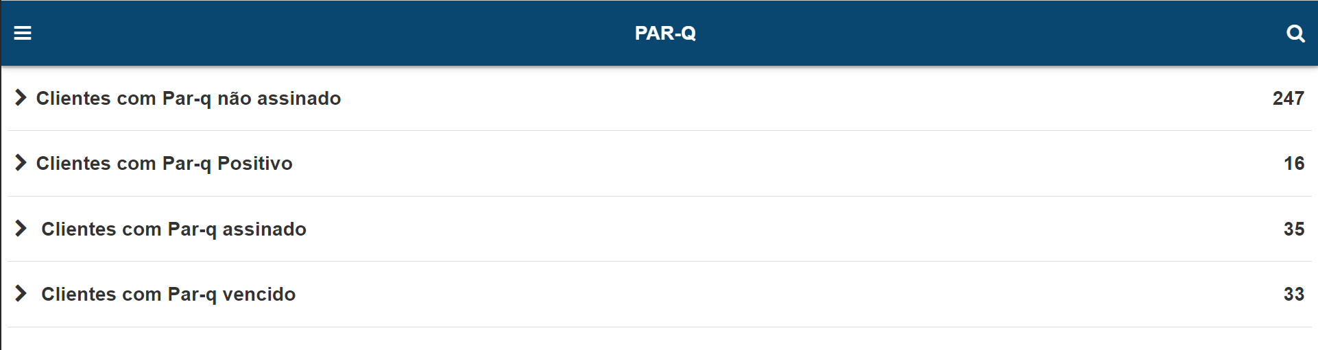 - Clientes com Par-q assinado: ao clicar nesta seção, serão apresentados os clientes que preencheram e já assinaram o formulário do Par-q;