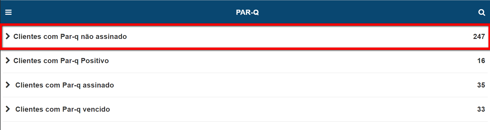 - Clientes sem Par-q assinado: ao clicar nesta seção, serão apresentados todos os clientes que ainda não preencheram o formulário do Par-q;