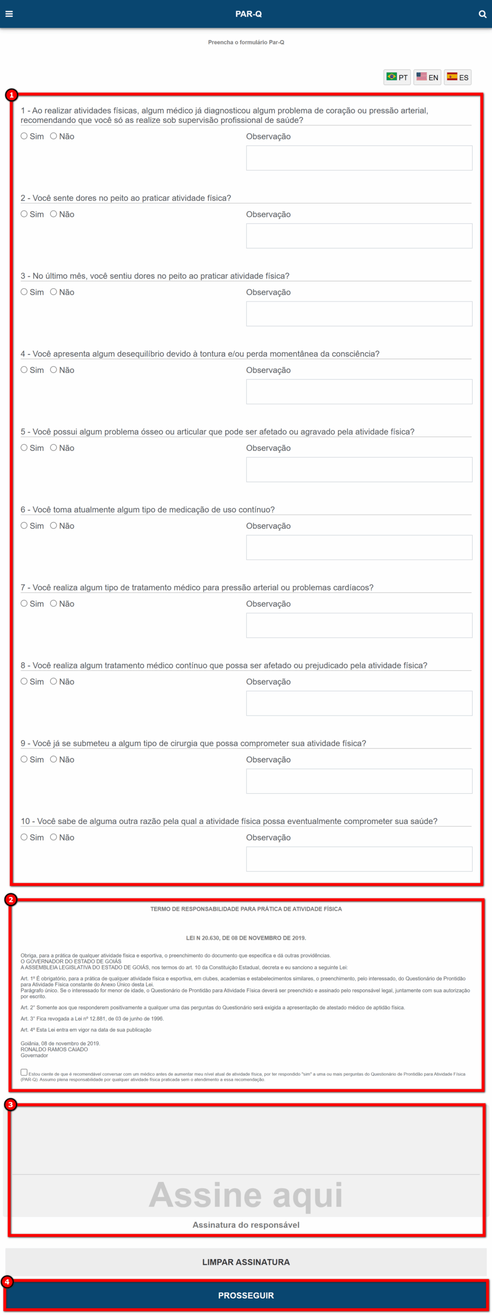 3. Preencha o formulário Par-Q, marque a opção "Termo de Responsabilidade para Prática de Atividade Física" e solicite ao cliente que assine no campo "Assine aqui". Após isso, clique em "Prosseguir";