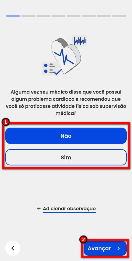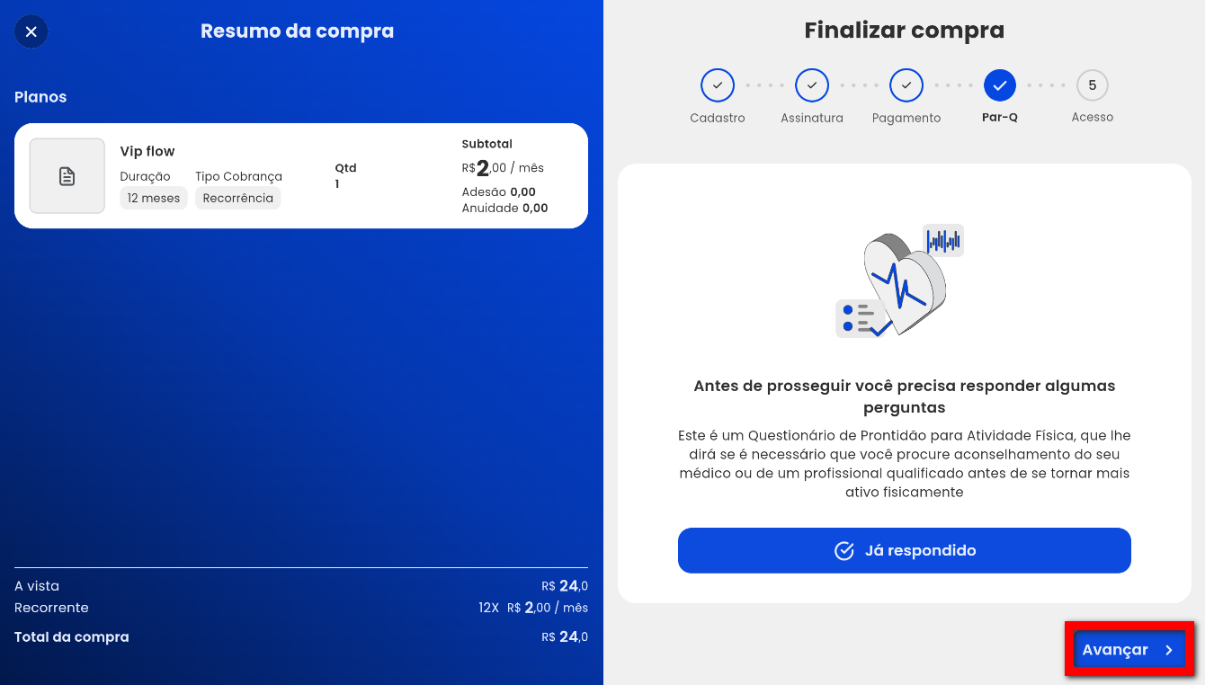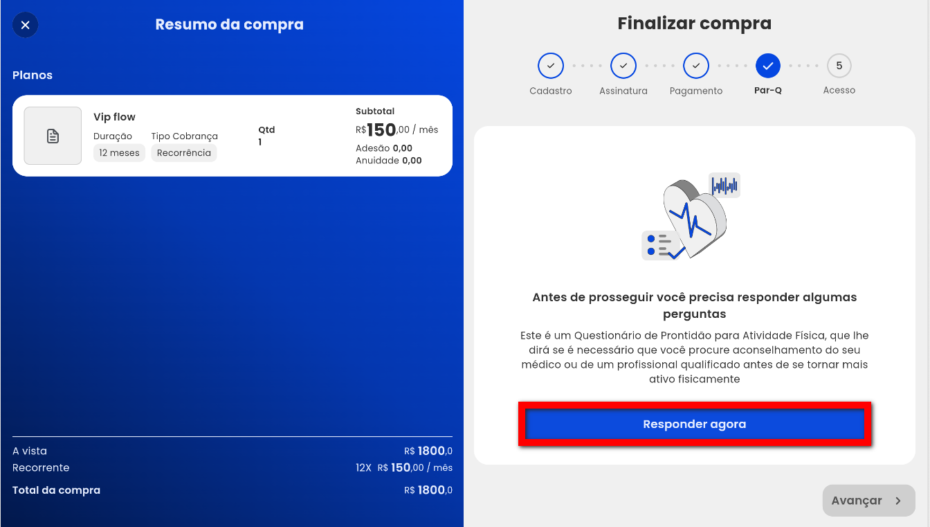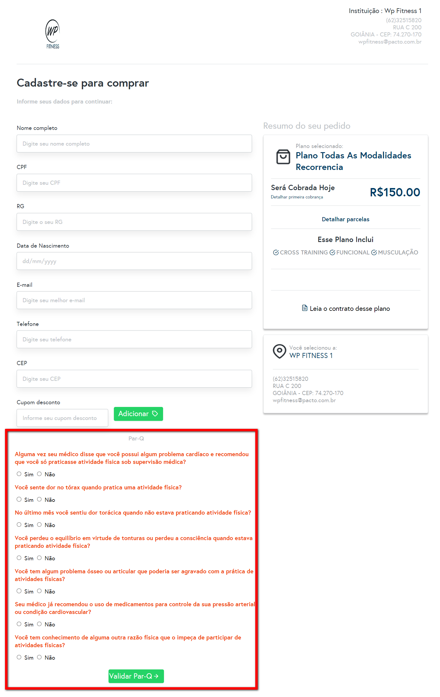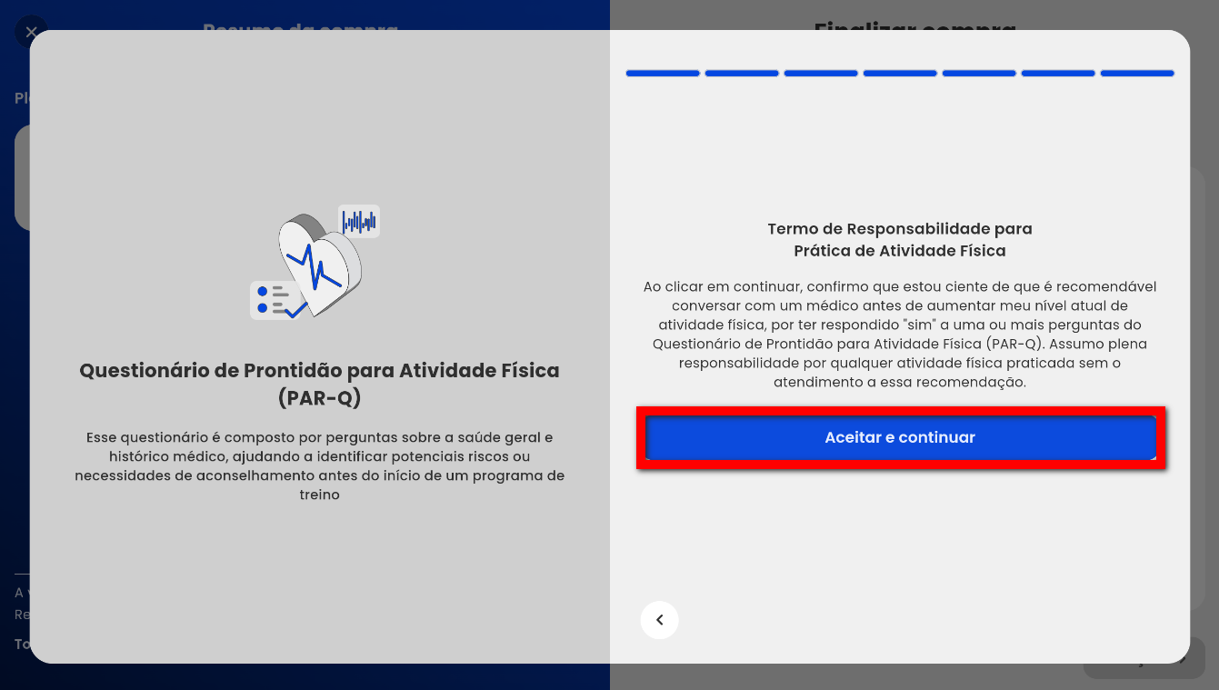 Observação: esta etapa só é obrigatória caso a configuração “Par-Q obrigatório ao final da compra” esteja habilitada.