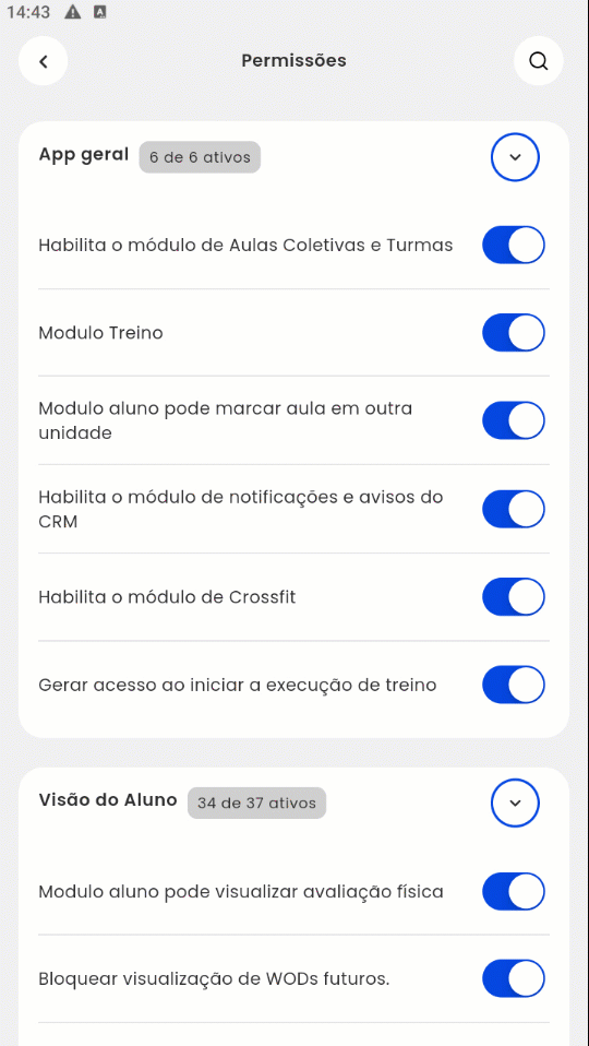 Para preencher o formulário Par-Q pelo APP Treino é necessário habilitar a permissão no Pacto App.