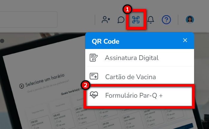 1. Após acessar o sistema, clique no ícone de “QR Code” apresentado no canto superior direito, e depois em “Formulário Par-Q +”;