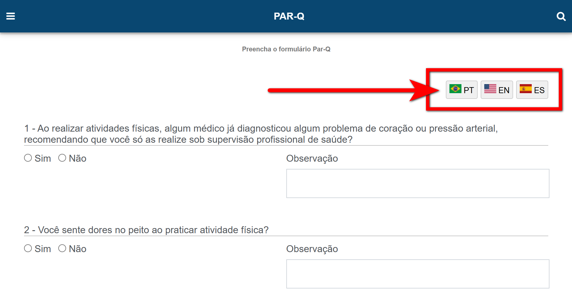 Dica: você pode alterar o idioma do PAR-Q clicando no ícone correspondente.