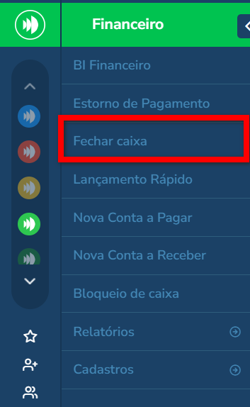 1. No menu lateral do módulo Financeiro, localize e clique em "Fechar Caixa";