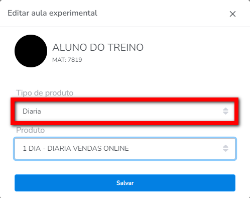 - Diária: filtra a visualização de todos os clientes que agendaram uma aula do tipo "Diária" em uma turma através do módulo Treino.