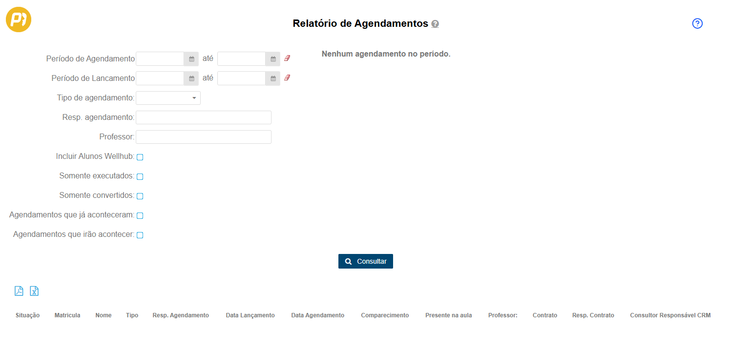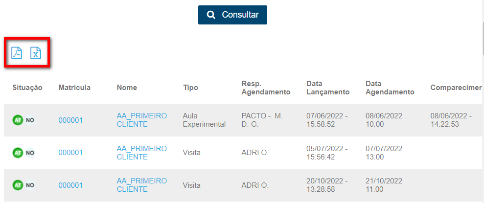 1. É possível exportar para Excel ou PDF clicando nos ícones agendamentos ;