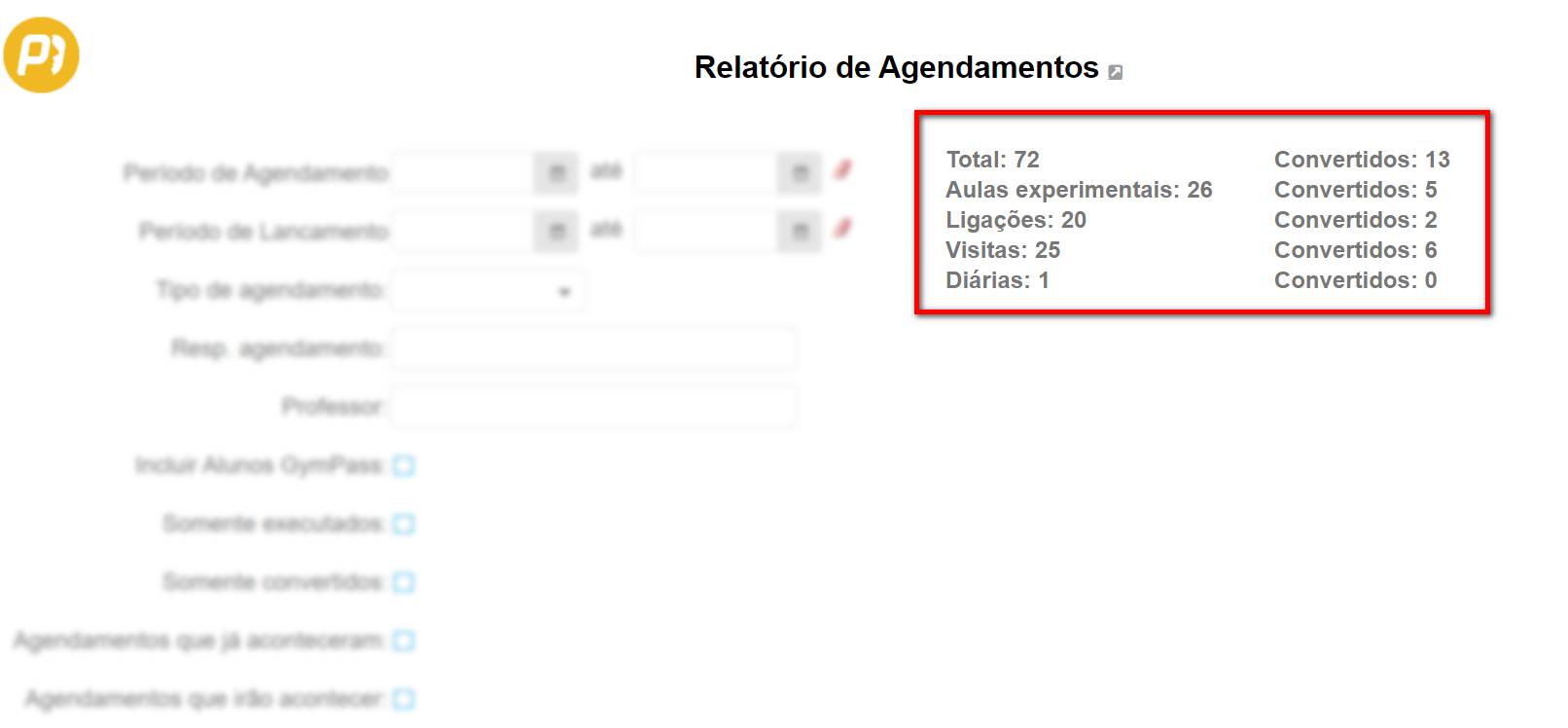 O Relatório de Agendamentos foi criado para dar ao gestor uma visão clara sobre as ligações, visitas e aulas experimentais que foram agendadas ao longo do dia.