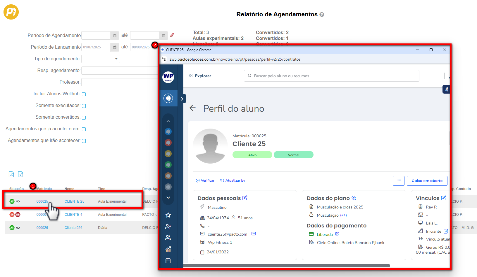 - Aula experimental: filtra a visualização de todos os clientes que agendaram uma aula experimental;