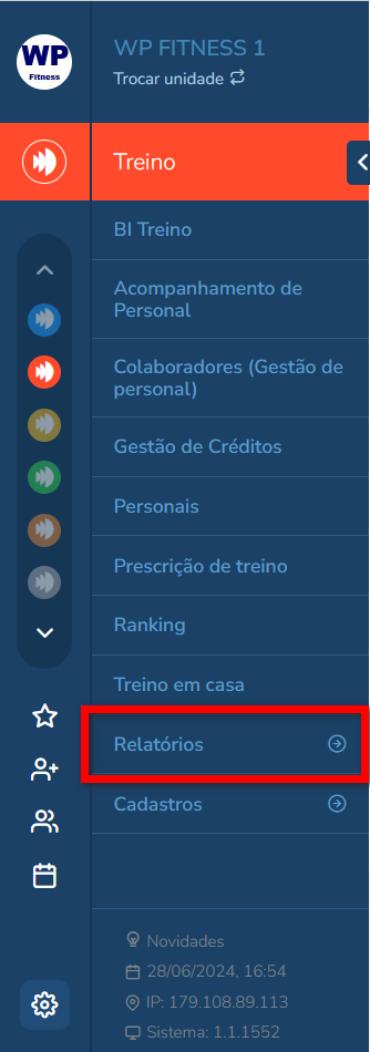 1. Ao acessar o módulo Treino, no menu lateral esquerdo clique em “Relatórios”;